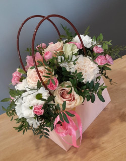 Композиция из белой хризантемы, кустовых роз и гортензии в изящной корзинке – это настоящий символ изысканности и элегантности. Белоснежные хризантемы, словно маленькие снежинки, легко и нежно покрывают всю композицию, придавая ей особую нежность и чистоту. Кустовые розы, с их изящными бутонами, добавляют букету нотку романтики и страсти, создавая гармонию между нежностью и страстью. Гортензия, с ее объемными соцветиями, придаёт композиции изысканный вид и делает ее по-настоящему уникальной. Изящная корзинка, в которой представлен этот букет, подчеркивает его изысканность и придает ему особый шарм.